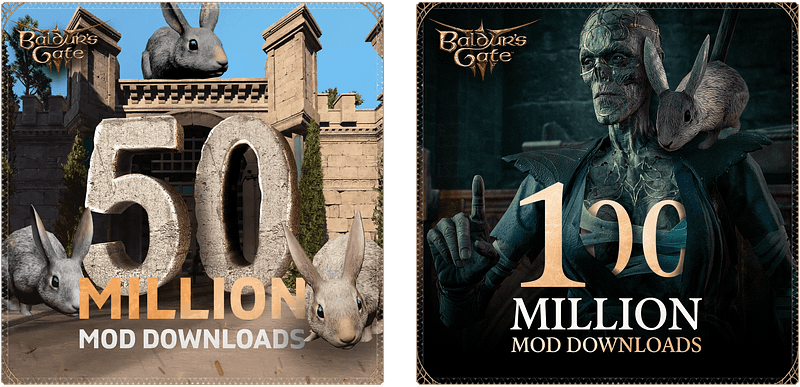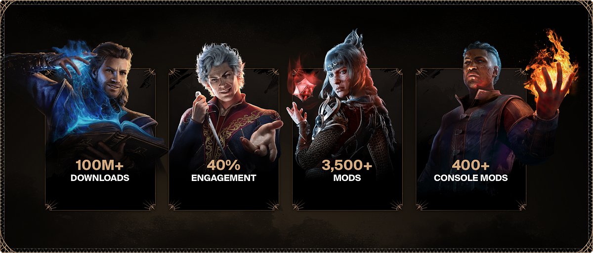 The results align with the game’s exceptional nature and Larian’s work engaging with mod authors in the Baldur’s Gate 3 community. Six months after release, their creators shared more than 3500 mods, which collectively generated over 100 million downloads. A record for any game using our service.
