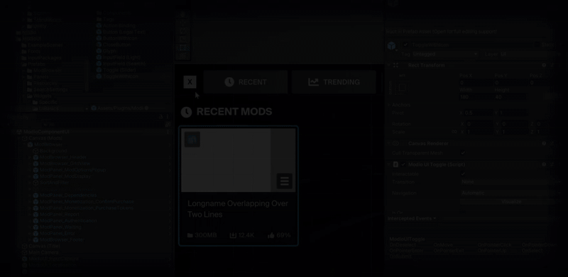Available for our Unreal & Unity Plugins, our new Component UI solution moves away from a relatively rigid template, to a new UI framework with independent components which work together, allowing more flexibility for developers to build their own mod browser UI.