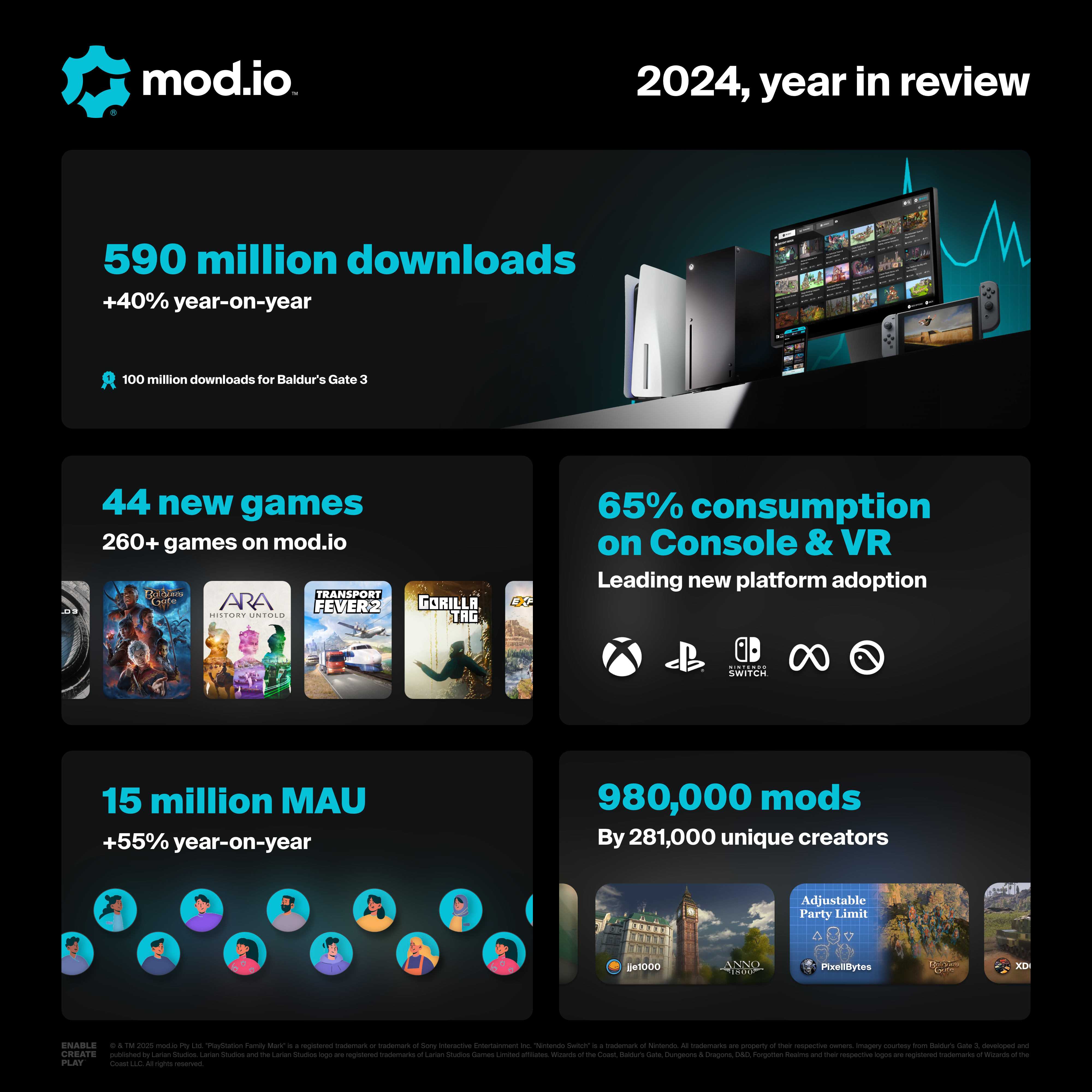 Improving mod.io for creators is one of our areas of focus for 2025. Fast growth has highlighted improvements required to meet the level of expectations of modders. Our work with partners has already led to changes; for example with moderation tools which have been significantly improved since Baldur’s Gate 3 release, in order to cater to the needs of a project of this size, and provide modders with better tools to interact safely and positively with their community.